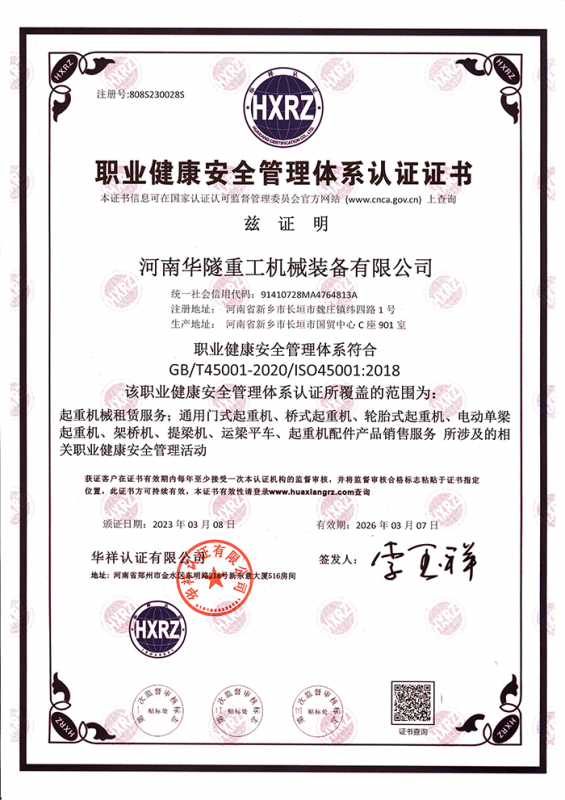 河南華隧重工機械裝備有限公司主要從事通用門式起重機、橋式起重機、電動單梁起重機,輪胎式起重機、架橋機、提梁機、遠梁平車、鋼絲繩電動萌蘆、卷揚機、起重配件制造、銷售:起重機械租賃、安裝和維修,起重設備園收,機械設備維修,鋼結構工程承包,橋梁工程及技術咨淘服務,銷售五金制品、機電設備:建設工程監理,建設工程設計,各類工程建設活動,建筑勞務分包,建筑物折除作業,施工作業,工程管理服務,土石方工程施工,裝如發運。  公司已通過IS0國際質量、環境、健康與安全三合一標準認證,特種設備制造許可證和特種設備安裝改造維修許可證。擁有完熟的質量管理體系。嚴格的管理制度,強大的生產能力和先進的檢測手段,在保證產品質量的同時,也具備了極強的市場競爭力?! 」緢猿挚萍紕撔聻槔砟?,產品質量為核心,注重信譽,建立了減信可靠、快捷、思速。便利周到的售后服務網絡。  我們擁有的技術專家和技術服務隊伍為客戶提供充善的售前技術支持和全天候的售后服務體系,讓您無后顧之憂,享受一站式的超值服務?!  叭A隧重工,伴您成功“是華隧重工永遠的宗指,真被的希望與各界朋友攜手并進。共創輝準!